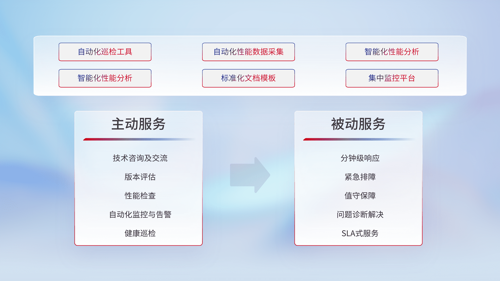 智能化工具和标准化文档,,,保障服务质量,,提供主动服务(包含技术咨询、、、、版本评估、、、性能检查、、、、自动化监控与告警、、、、健康巡检)和被动服务包含(分钟级响应、、、紧急排障、、、值守保障、、问题诊断解决、、SLA服务)。。。。